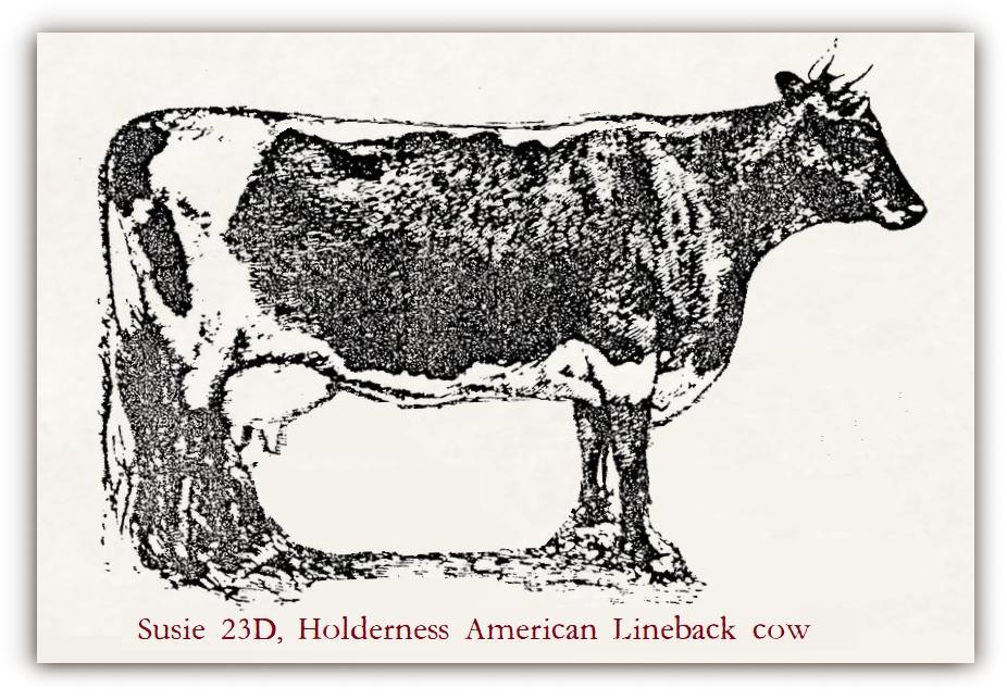 AMERICAN LINEBACK dairy cattle; This population may include some animals of historic breeding, but the American Lineback dairy cattle breed contains Holstein and/or Milking Shorthorn upgrading, and falls short of the genetic definition of a pure heritage breed. {image credit: Susie 23D, Holderness American Lineback cow owned by Mr. Truman A. Cole, Solsville, N.Y., late 1880s.}
